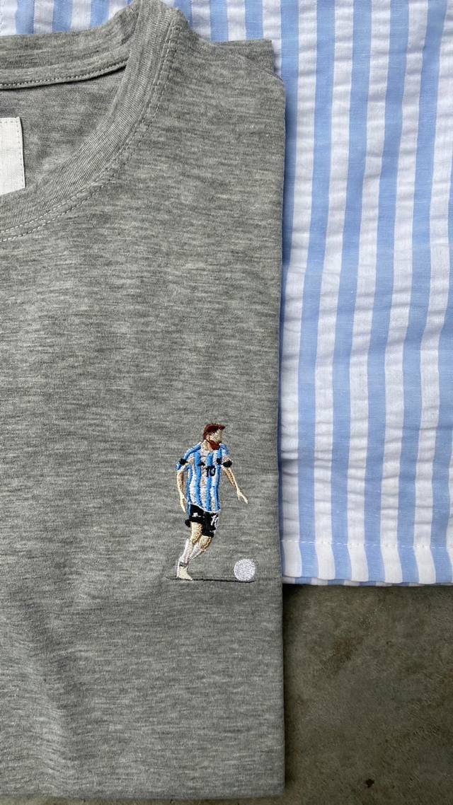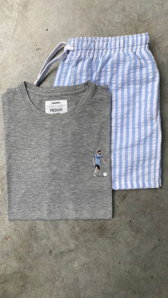 Pijama de algodón 100%. Remera bordada de algodón pima peruano. Short Rayado 100% algodón.
